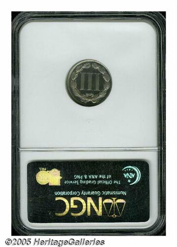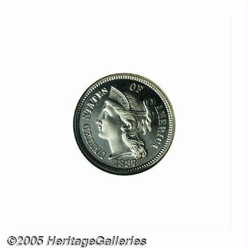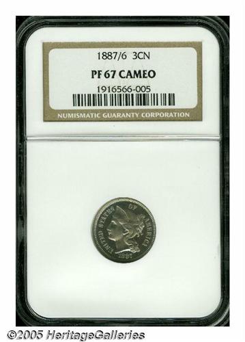 <B>1887/6<3CN> PR67 Cameo NGC.</B></I> Nicely contrasted with milky lilac and ice-blue overtones that lend an aura of originality to this Superb specimen. Although not overly scarce as an overdate, today's collectors are often intrigued by such an obvious blunder on a proof striking. Population: 7 in 67 Cameo, 2 finer (6/05).