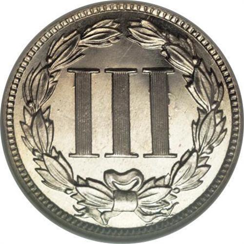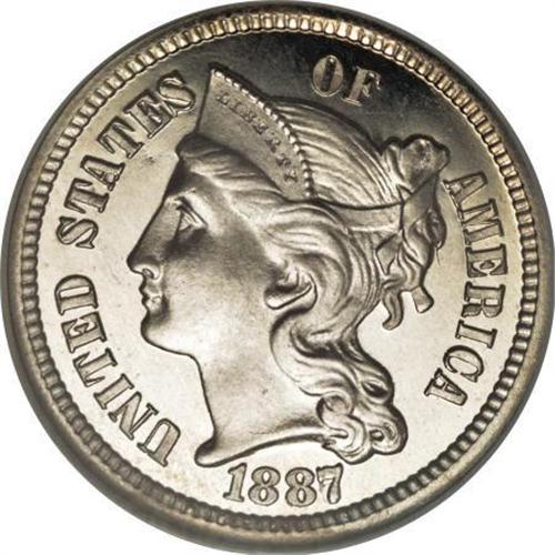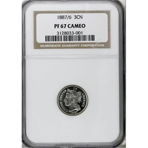<B>1887/6 3CN PR67 Cameo NGC.</B></I> Bold overdate features are evident on this Superb Gem Cameo proof. It is one of the few proof-only overdates in American numismatics. All design motifs are fully and completely defined, with frosty luster on the devices and deep mirrors in the fields. Census: 10 in 67 Cameo, 2 finer (1/08).<BR><BR><b>Shipping:</b> Coins & Currency (<a target="_blank" href="http://www.heritageauctions.com/common/shipping.php">view shipping information</a>)