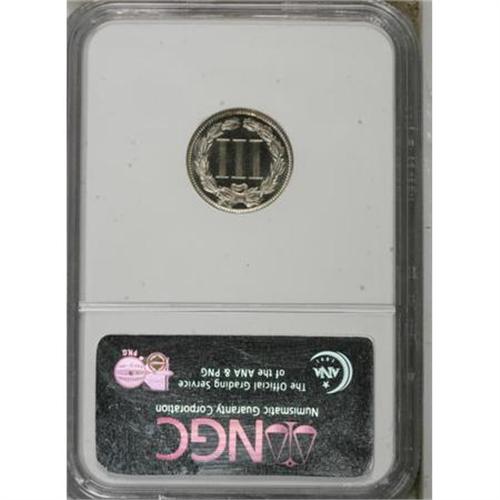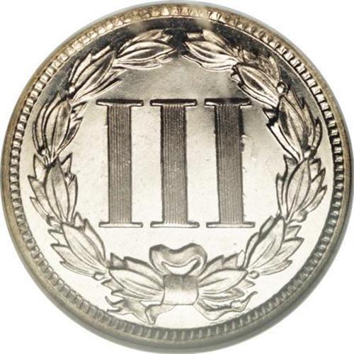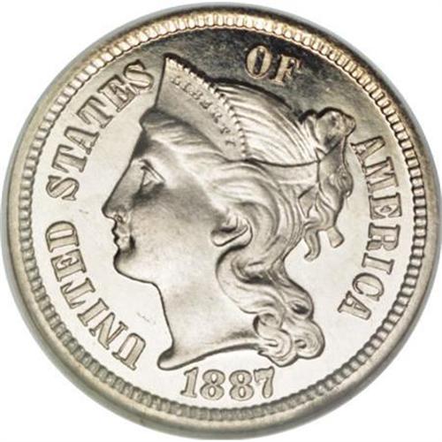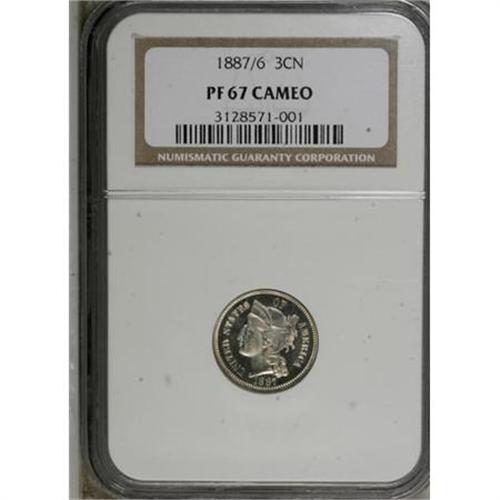 <B>1887/6 3CN PR67 Cameo NGC.</B></I> The 6 underdigit is plain, and recutting is also visible on both 8s. Pleasing cameo contrast and faint gold toning combine to ensure the exceptional eye appeal. Clashed to the right of the third denominational column. A popular overdate. Census: 11 in 67 Cameo, 2 finer (3/08).<BR><BR><b>Shipping:</b> Coins & Currency (<a target="_blank" href="http://www.heritageauctions.com/common/shipping.php">view shipping information</a>)