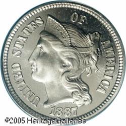 <B>1887/6 3CN  PR67 Cameo PCGS.</B></I> A sharply struck and untoned Superb Gem, with impressive white on black contrast and deeply reflective fields. The underdigit is crystal clear, as is usual for the variety. Struck from a clashed reverse die. An absolutely stunning example. Population: 3 in PR67 Cameo, 0 finer (1/05).<BR><I>From the Bruce Scher #1 All-Time PCGS Registry Set.</B></I>   Lot:4049