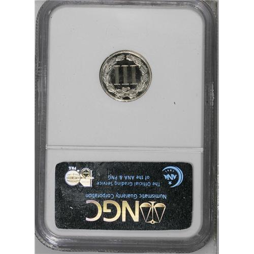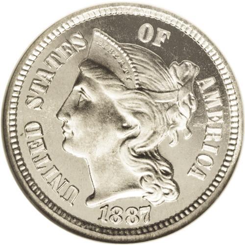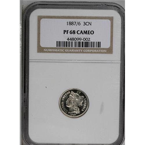 <B>1887/6<3CN> PR68 Cameo NGC.</B></I> A dazzling, wondrously preserved specimen with noticeable contrast on both sides and deeply reflective, untoned surfaces. The underdigit is crystal clear, as is usual for the '87/6 three cent nickel proof variety, and the near-perfect quality places it with just one other Proof 68 Cameo specimen at NGC as the finest known at either service (7/06).
