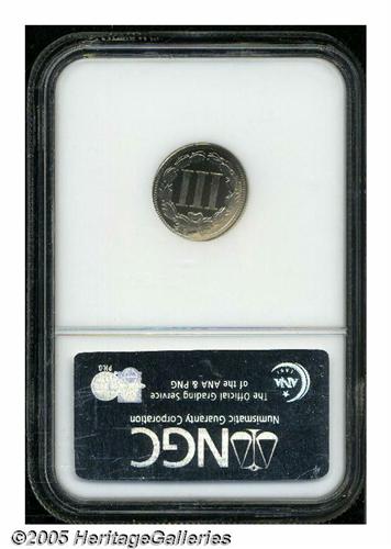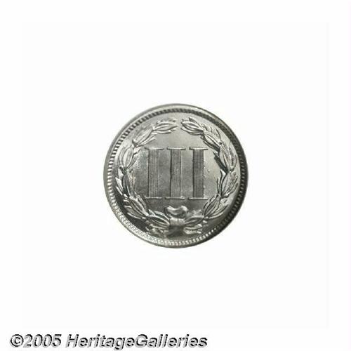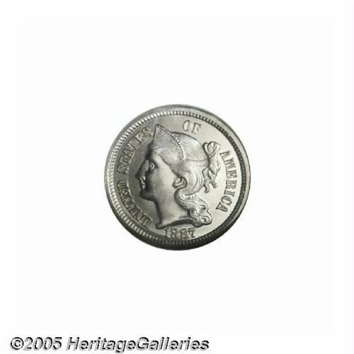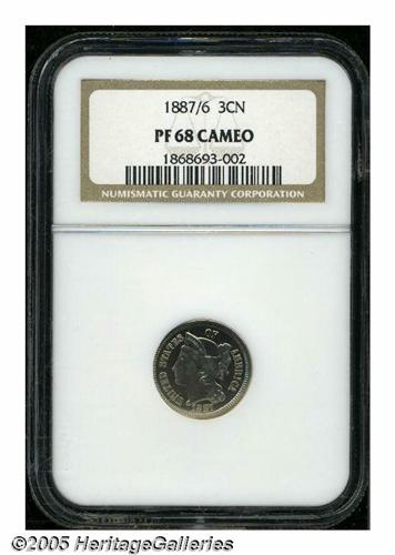 <B>1887/6<3CN> PR68 Cameo NGC.</B></I> A dazzling, wondrously preserved specimen with noticeable contrast on both sides and deeply reflective, untoned surfaces. The underdigit is crystal clear, as is usual for the '87/6 Three Cent Nickel proof variety, and the near-perfect quality is places it among the finest known. Population: 2 in 68 Cameo, 0 finer (6/05).