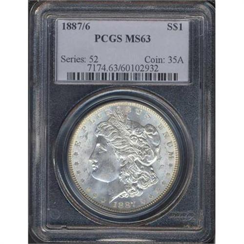 <b>1887/6 Morgan Dollar. PCGS graded MS63.</b> VAM-2. A Top 100 variety. The 1887/6, while not as rare as its New Orleans Mint counterpart, still is an important Guide Book variety within this widely collected series. Lustrous fields ripple with original mint bloom. Against this are set nicely subdued, matte design elements <b>(PCGS # 7174)</b>