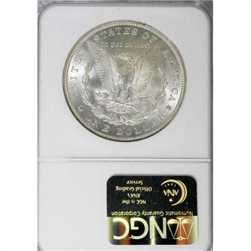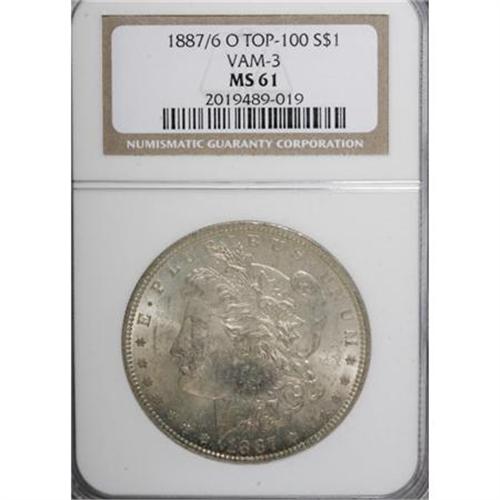 <B>1887/6-O $1 MS61 NGC.</B></I> VAM-3. A Top 100 Variety. This lustrous overdated New Orleans dollar has dusky golden-gray toning that is moderately more prominent on the obverse. The cheek and neck show scattered marks, principally concealed by the patina.<BR><BR><B>Coin Engraver:</B> George T. Morgan<BR><BR><b>Shipping:</b> Coins & Currency (<a target="_blank" href="http://www.heritageauctions.com/common/shipping.php">view shipping information</a>)