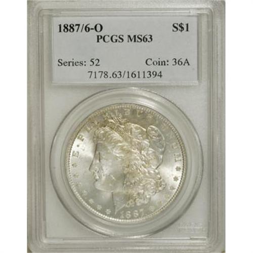 <B>1887/6-O $1 MS63 PCGS.</B></I> VAM-3. A Top 100 Variety. A lovely Select example of this branch mint overdate, strongly lustrous with a measure of peach patina at the upper obverse and untoned surfaces elsewhere. Lightly abraded overall with this issue's usual soft definition at the centers.<BR><I>From The Mario Eller Collection, Part One.</B></I><BR><BR><B>Coin Engraver:</B> George T. Morgan<BR><BR><b>Shipping:</b> Coins & Currency (<a target="_blank" href="http://www.heritageauctions.com/common/shipping.php">view shipping information</a>)