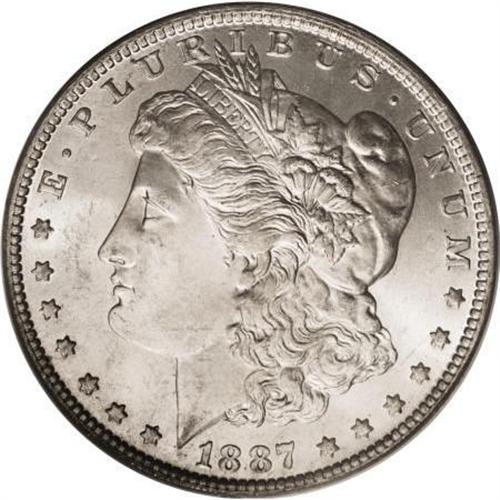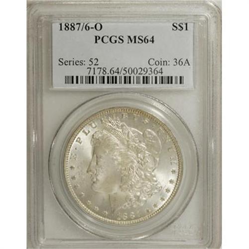 <B>1887/6-O $1 MS64 PCGS.</B></I> VAM-3. A Top 100 Variety. The right outside curve of the underlying 6 is barely visible to the lower right of the 7. Occasional hints of light tan-gold color adhere to the highly lustrous surfaces of this near-Gem specimen that is generally well struck, except for the usual softness in the centers. A few minute obverse marks define the grade. Rarely available any finer. Population: 79 in 64, 0 finer (7/07).<BR><I>From The Arnold & Harriet Collection, Part Two.</B></I><BR><BR><B>Coin Engraver:</B> George T. Morgan<BR><BR><b>Shipping:</b> Coins & Currency (<a target="_blank" href="http://www.heritageauctions.com/common/shipping.php">view shipping information</a>)
