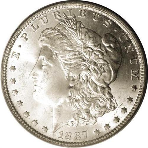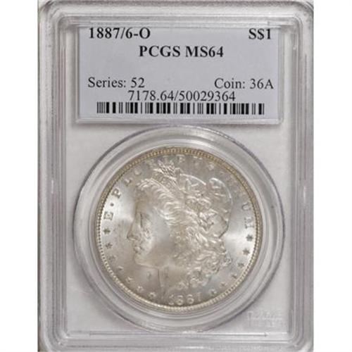 <B>1887/6-O $1 MS64 PCGS.</B></I> VAM-3. A Top 100 Variety. The right outside curve of the underlying 6 is barely visible to the lower right of the 7. Occasional hints of light tan-gold color adhere to the highly lustrous surfaces of this near-Gem specimen that is generally well struck, except for the usual softness in the centers. A few minute obverse marks define the grade. Rarely available any finer. Population: 79 in 64, 0 finer (7/07).<BR><BR><B>Coin Engraver:</B> George T. Morgan<BR><BR><b>Shipping:</b> Coins & Currency (<a target="_blank" href="http://www.heritageauctions.com/common/shipping.php">view shipping information</a>)
