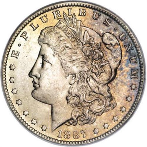 <B>1887/6-O $1 MS64 PCGS.</B></I> VAM-3. A Top 100 Variety. Medium golden-brown, plum-gray, and ocean-blue endow much of the obverse, although the cheek and left obverse field are nearly brilliant. The reverse is untoned aside from an occasional wisp of tan-gold. The eagle's breast and the hair above the ear are typically struck for this scarce <I>Guide Book </B></I>VAM. Population: 82 in 64, 0 finer (12/07).<BR><BR><B>Coin Engraver:</B> George T. Morgan<BR><BR><b>Shipping:</b> Coins & Currency (<a target="_blank" href="http://www.heritageauctions.com/common/shipping.php">view shipping information</a>)