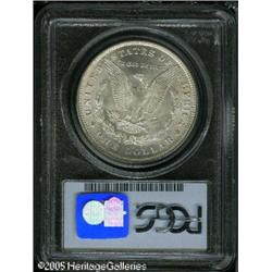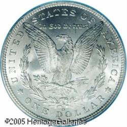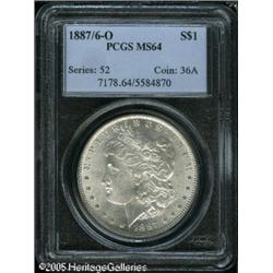 <B>1887/6-O<img border='0' src='http://www.heritagecoins.com/images/star.gif' width=10 height=10>$1 MS64 PCGS.</B></I> VAM-3. A Top 100 Variety. A nicely struck better date Dollar that has faint tan color and potent cartwheel luster. Carefully preserved, the fields are clean and only a light slide mark above the jaw precludes a finer grade. The remnants of the 6 underdigit are similar to that seen on the 1887/6 Philadelphia Mint variety. Population: 68 in 64, 0 finer (1/05).<BR><I>From The Banks Collection.</B></I> Lot:10256