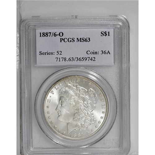 <B>1887/6-O<img border='0' src='http://www.heritagecoins.com/images/star.gif' width=10 height=10>$1> MS63 PCGS.</B></I> VAM-3. A Top 100 Variety. The underdigit appears under magnification. A lustrous and well struck example of this popular variety, which has scattered abrasions on both sides appropriate for the grade.