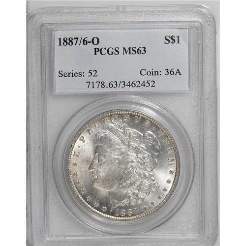 <B>1887/6-O<img border='0' src='http://www.heritagecoins.com/images/star.gif' width=10 height=10>$1> MS63 PCGS.</B></I> VAM-3. A Top 100 Variety. The bottom of the 6 is barely visible with magnification. Scarce in any grade with Select coins especially difficult. Mostly untoned and generally well struck.