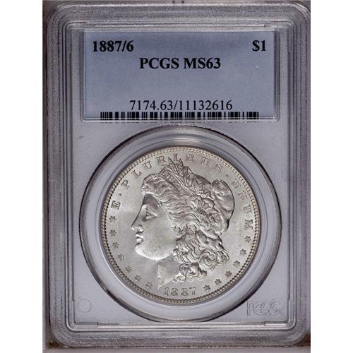 <B>1887/6<img border='0' src='http://www.heritagecoins.com/images/star.gif' width=10 height=10>$1> MS63 PCGS.</B></I> VAM-2. A Top 100 Variety. A satiny and untoned example that exhibits suitable definition on the eagle's breast and above Liberty's ear. Attractive for the grade despite the expected wispy obverse marks.
