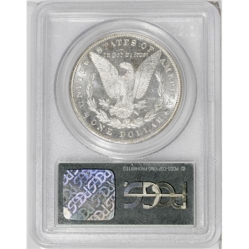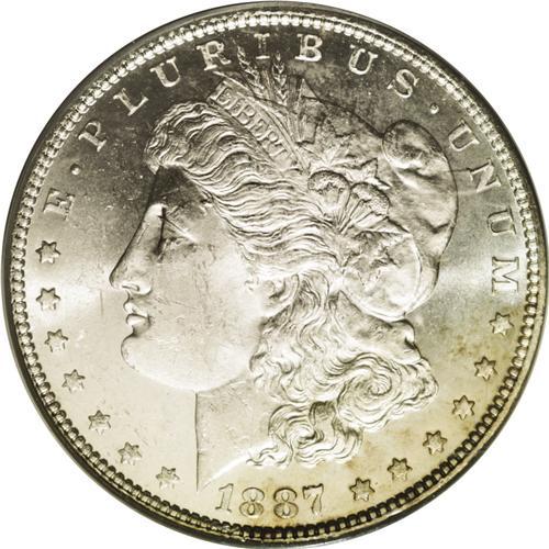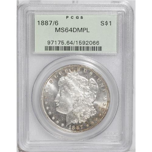 <B>1887/6<img border='0' src='http://www.heritagecoins.com/images/star.gif' width=10 height=10>$1> MS64 Deep Mirror Prooflike PCGS.</B></I> VAM-2. A Top 100 Variety. Prooflike and Deep Mirror Prooflike examples of this popular <I>Guide Book</B></I> issue are somewhat of a curiosity. One would think that by polishing the dies, there would be a strong likelihood that the thin arc of the 6 might be effaced. That is not the case, however, as the underdigit is as plain on this flashy, lightly toned example as it is on a non-prooflike example. Still, very few Prooflike or DMPL pieces are known, as evidenced by the population data. Population: 7 in 64 DMPL, 3 finer (7/06).