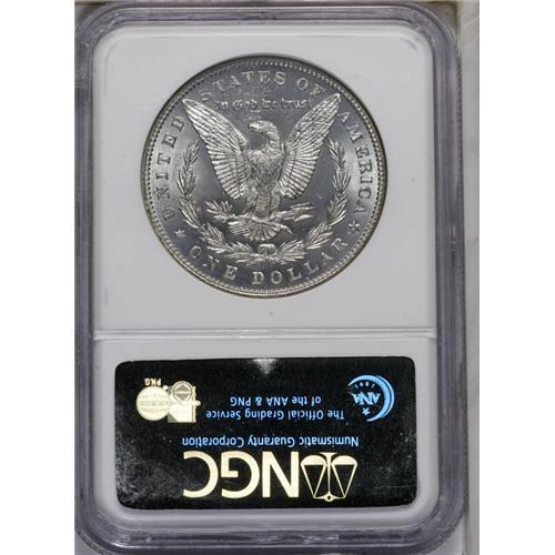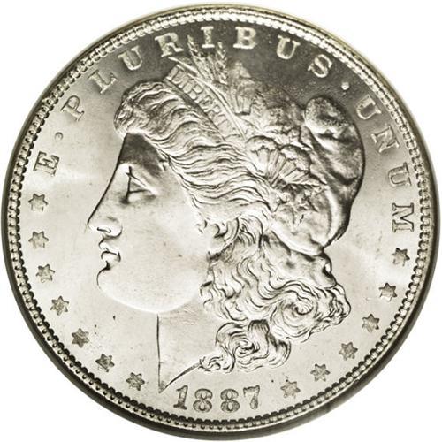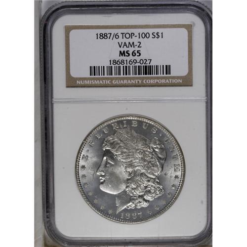 <B>1887/6<img border='0' src='http://www.heritagecoins.com/images/star.gif' width=10 height=10>$1> MS65 NGC.</B></I> VAM-2. A Top 100 Variety. The lower loop of the underdigit 6 protrudes plainly from the bottom of the 7. This bright, untoned silver dollar offers scintillating luster and surfaces that are free of all but a few scattered, undistracting abrasions that are consistent with the Gem grade. Census: 36 in 65, 1 finer (6/06).