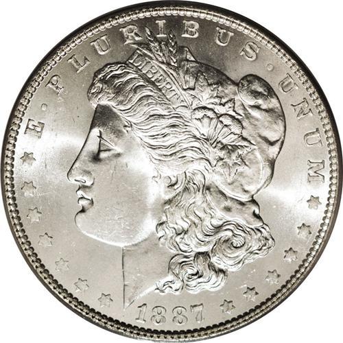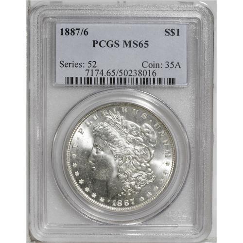 <B>1887/6<img border='0' src='http://www.heritagecoins.com/images/star.gif' width=10 height=10>$1> MS65 PCGS.</B></I> VAM-2. A Top 100 Variety. Overdate varieties exist for both Philadelphia and New Orleans Mint coinage in 1887, but not from San Francisco, although some have speculated that such a variety could exist. This is an extremely important opportunity as higher grade examples are virtually nonexistent, with only four finer pieces certified by PCGS, including two prooflike examples. Both sides of this Gem are sharply detailed and fully brilliant with frosty silver luster.