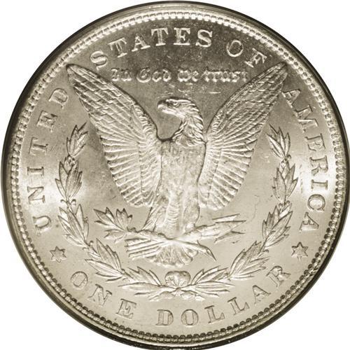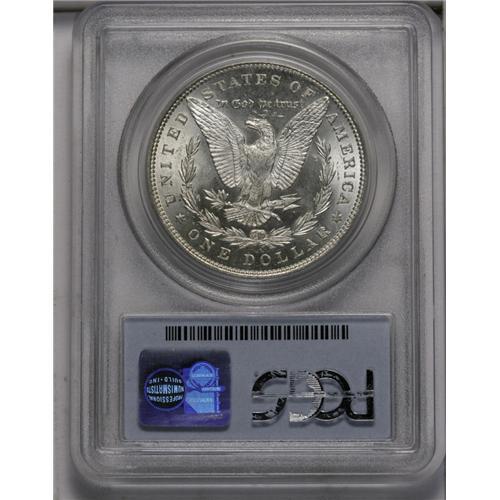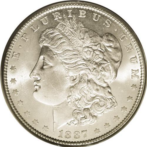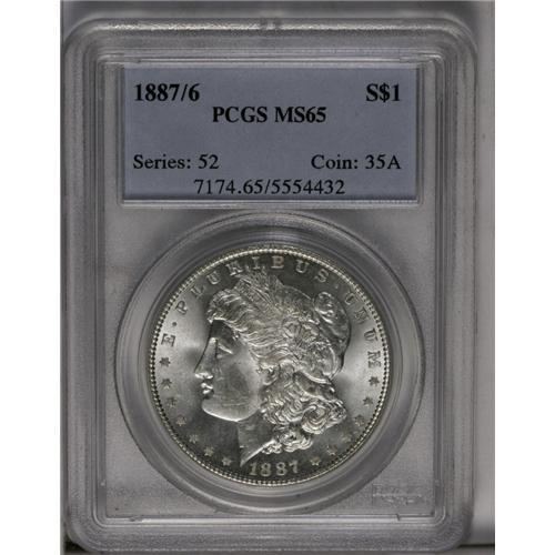 <B>1887/6<img border='0' src='http://www.heritagecoins.com/images/star.gif' width=10 height=10>$1> MS65 PCGS.</B></I> VAM-2. A Top 100 Variety. As both a <I>Guide Book</B></I> variety and a Top 100 variety, this piece (along with its O-mint sibling) is nowadays considered an integral part of a complete Morgan dollar collection. The present example shows blasting luster over untoned silver-blue surfaces. A couple of faint scrapes on Liberty's cheek apparently preclude a higher grade, but the appearance is quite high-end overall. The reverse shows some faint die clashing. Both NGC and PCGS have certified only three coins finer (6/06).