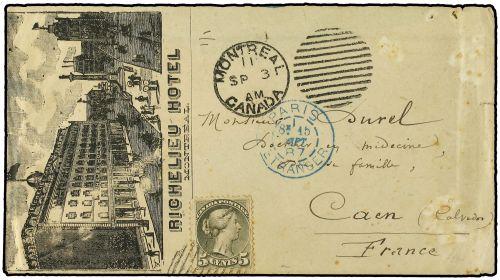 1887 Advertising envelope for Richelieu Hotel, Montreal to Caen, France, franked QV 5c. and cancelle