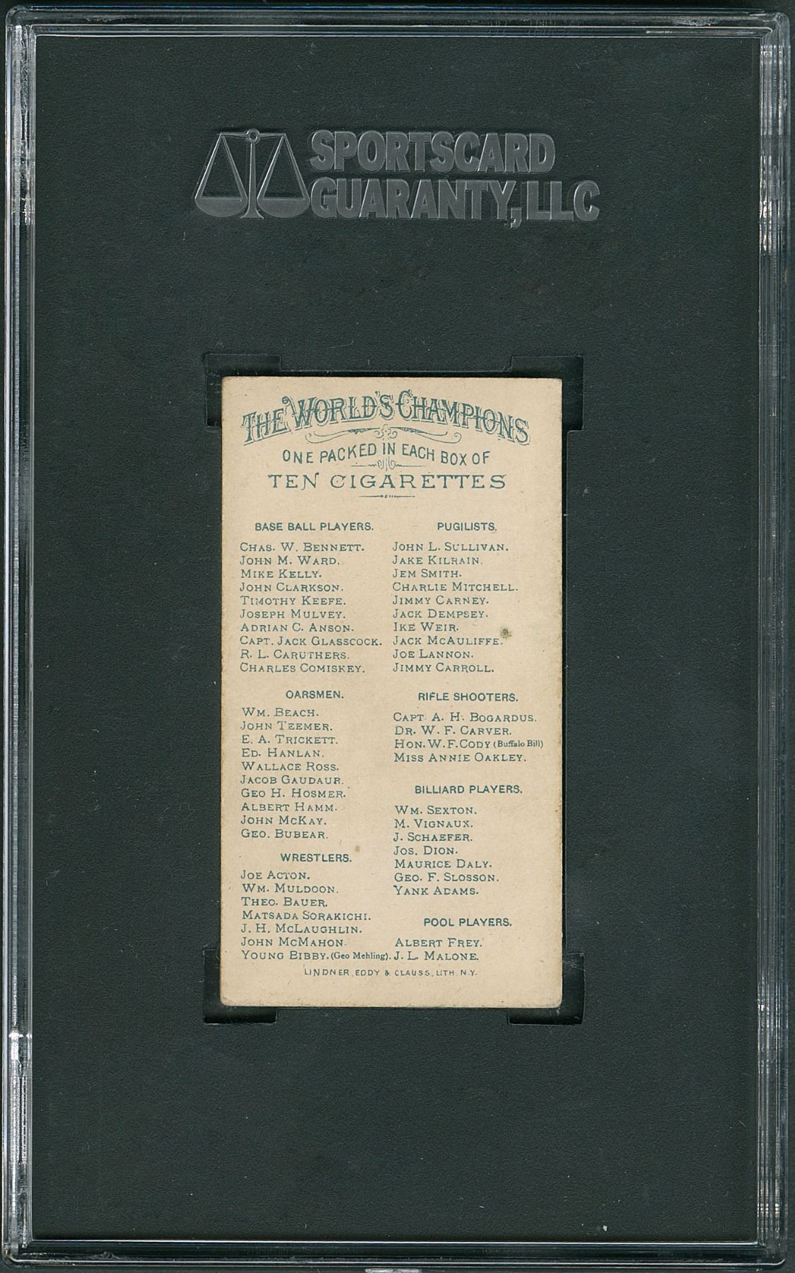 Graded by SGC 40 VG 3. Cap Anson was the greatest ballplayer of the 19th Century, the first to amass over 3,000 hits, and he is still the Chicago Cubs leader in batting average, runs, hits, doubles, and RBIs. This 1887 N28 Allen & Ginter card was issued at the height of Anson’s career, when he was the top run producer in the game. This example boasts a well-centered, fully focused image with bright color and four evenly touched corners. The reverse is well struck with one small print blemish.