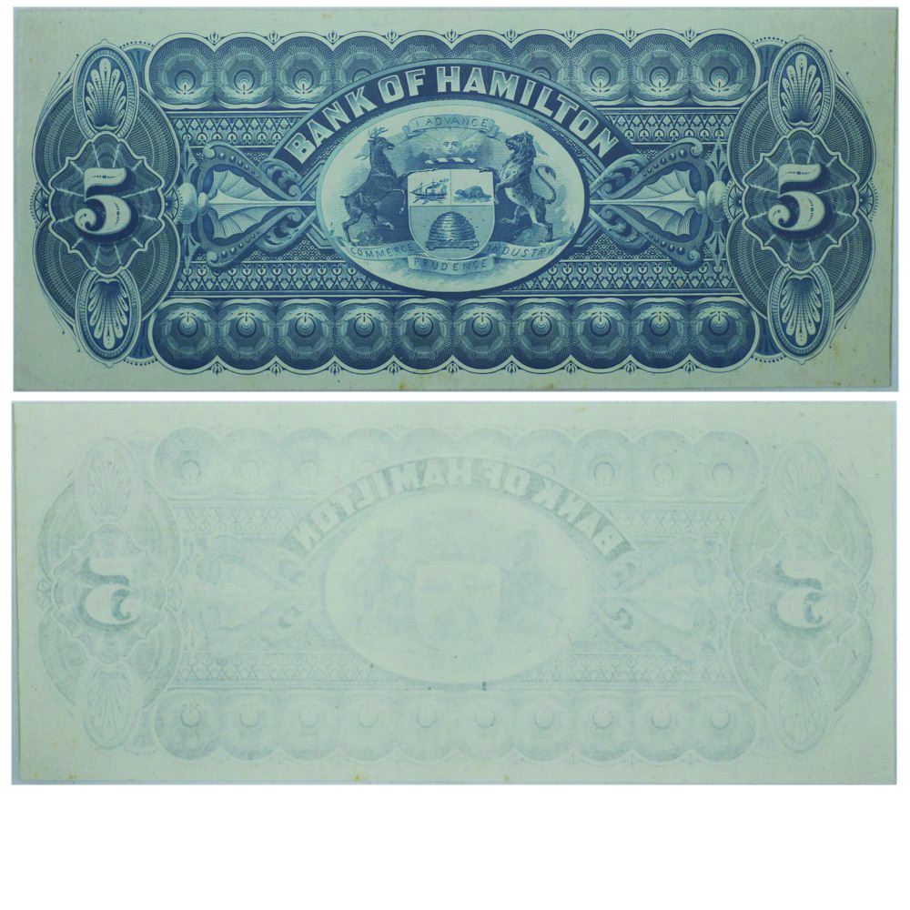1887 Bank of Hamilton Proof $5. 345-14-14P, Blue Tint, BCS UNC-60, Original.