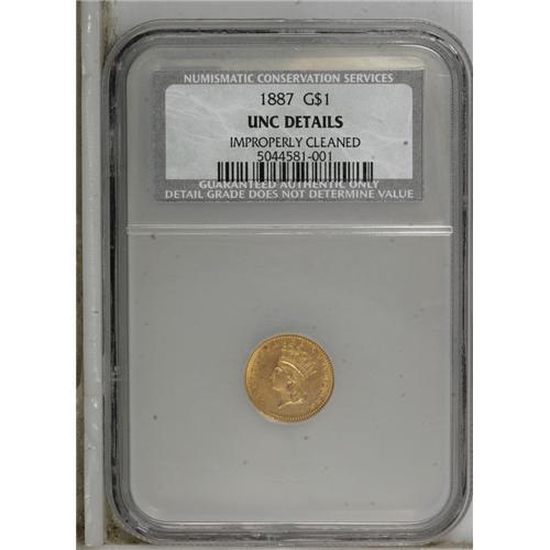 <B>1887 G$1 --Improperly Cleaned--NCS. Unc Details.</B></I> NGC Census: (1/395). PCGS Population (8/487). Mintage: 7,500. Numismedia Wsl. Price for NGC/PCGS coin in MS60: $383. (#7588)<BR><BR><b>Shipping:</b> Coins & Currency (<a target="_blank" href="http://www.heritageauctions.com/common/shipping.php">view shipping information</a>)