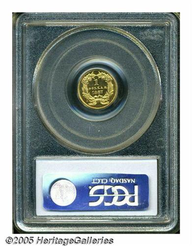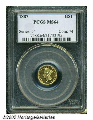 <B>1887<G$1> MS64 Prooflike PCGS.</B></I> This is a wonderful prooflike example struck in bright yellow-gold with exceptional surfaces, marred only by a minor reverse scratch.