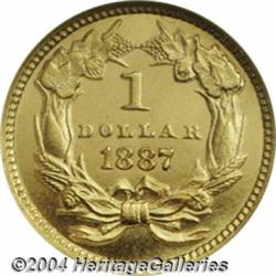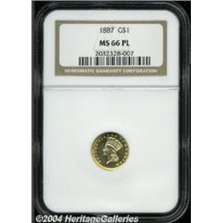 <B>1887<G$1> MS66 Prooflike NGC.</B></I> An impressively mirrored premium Gem that has a seemingly full strike. A well preserved and attractive representative of this low mintage issue. A mere 7,500 pieces were struck, although some high grade examples were set aside as souvenirs by contemporary numismatists. The dies are moderately rotated counterclockwise. LIBERTY is faintly die clashed (as made) near the date. Population: 39 in 66, 14 finer (6/04). <BR><BR><B>Important notice:</B> Heritage usually auctions material at the rate of 200-250 lots per hour. On some occasions eBay Live bid software or the Internet may not be able to keep up with the pace of the auction. We recommend placing a realistic absentee bid now as insurance to avoid disappointment. Occasionally the auctioneer may eliminate or reject an eBay Live bid, and the auctioneer may also reopen a lot after the close of the eBay live bidding (usually because we missed an audience bid), and may reject your bid even if it shows you as the winning bidder. By bidding via eBay Live, you agree that Heritage may award the lot to another bidder at its sole discretion under the circumstances described above or any other reasonable circumstances. Since eBay bids are not shown to us until we open the lot on the floor, we treat those bids just like floor bids. In most cases the floor responds before the eBay bid is presented to us, due to Internet lag time, so for consistency we have made it a policy that floor bids are always considered first over tie eBay live bids. Also please note that all Heritage lots purchased through eBay Live carry a 20% Buyer's Premium. Please make sure you read the Terms and Conditions before you bid. </span></font></tr></table></td></tr></table>