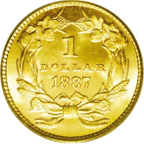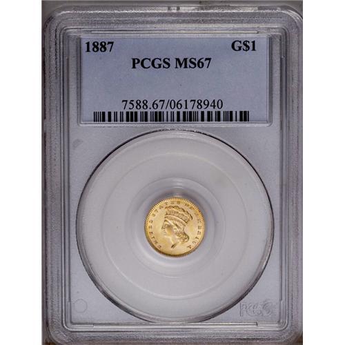 <B>1887<G$1> MS67 PCGS.</B></I> The 1887 is another low mintage issue from the 1880s with only 7,500 pieces struck. This piece must have been from a later state of the dies as it does not show any evidence of the prooflikeness that is often seen on this date. Sharply struck, the surfaces are smooth overall with the soft, frosted mint luster that is commonly seen on well-produced coins from the Philadelphia Mint. The medium yellow-gold surfaces are virtually abrasion-free with the only noticeable mark that could be useful for pedigree purposes being a tiny abrasion below the base of Liberty's bust. Population: 21 in 67, none are finer (4/06).