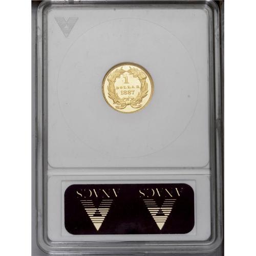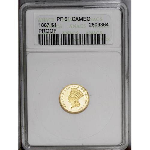 <B>1887 G$1 PR61 Cameo ANACS.</B></I> One of the more available of the proof gold dollars, this issue is scarce as a proof, and few of the original mintage of 1,043 pieces survive. Boldly defined with yellow-gold color and the small marks one might expect of the assigned grade.