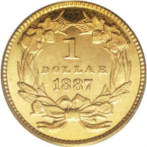 <B>1887 G$1 PR64 Cameo PCGS.</B></I> Mintages of proof gold dollars reached substantial levels, with over 1,000 coined each year from 1884 to 1889. In 1887, the mintage was 1,043 proofs. Those mintages gave contemporary collectors an opportunity to acquire a gold proof at a modest price level, when most could not afford more than a dollar or two per coin for their collections. Similarly, enough survive today that 21st century collectors have the same opportunity. This piece has delightful lemon-yellow color with traces of orange toning, especially on the reverse. Population: 6 in 64, 14 finer (8/07).<BR><BR><b>Shipping:</b> Coins & Currency (<a target="_blank" href="http://www.heritageauctions.com/common/shipping.php">view shipping information</a>)