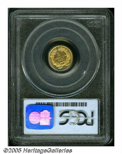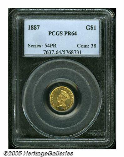 <B>1887<G$1> PR64 PCGS.</B></I> The closed wreath at the top of the reverse distinguish this as a proof striking, and not one of the numerous prooflike business strikes. The mintage for proofs was 1,043 pieces for gold dollars in 1887, and the approximately 175 survivors are among the most plentiful specimen strikings of the type in today's market. This is a nicely mirrored example that displays rich orange-gold coloration on each side with a touch of lilac here and there.