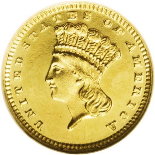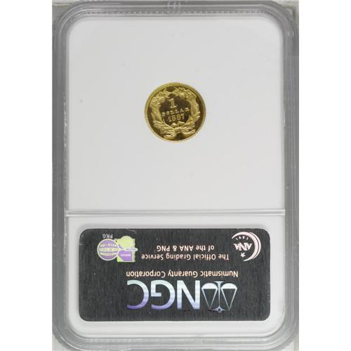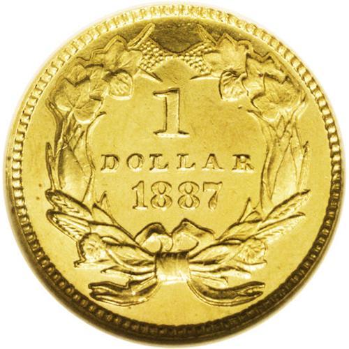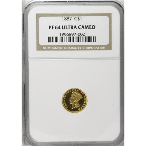 <B>1887<G$1> PR64 Ultra Cameo NGC.</B></I> The <I>Guide Book</B></I> reports a mintage of 1,043 proofs were struck. For a 19th century gold proof, this figure is relatively high. Yet according to the 9/06 NGC Census, only 59 proof 1887 gold dollars have been certified by the service, regardless of grade or cameo designation. At least a portion of these are resubmissions. The question arises, what happened to most of the proof mintage? One possible explanation was that the gold dollar was a popular denomination for love tokens. Since gold dollars did not circulate in the 1880s, the best way to obtain an example was to purchase a proof from the mint. Jewelers then planed the reverse to provide a surface for initials or a personal inscription. Fortunately, the present intricately struck example avoided such a fate. A thin vertical mark is noted east of the prominent 1. Census: 2 in 64 Ultra Cameo, 4 finer (9/06).