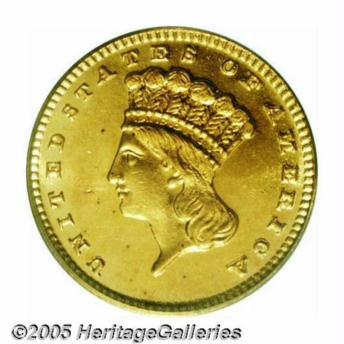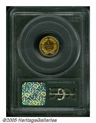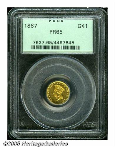 <B>1887<G$1> PR65 PCGS.</B></I> Rich yellow-gold in appearance, both sides are deeply reflective with typically sharp striking definition throughout. There are no disturbing hairlines or contact marks, but a few scattered black flecks are seen on the obverse. The Mint produced 1,043 proof Gold Dollars in 1887, and the approximately 175 survivors are among the most plentiful specimen strikings of the type in today's market. Population: 16 in 65, 14 finer (3/05).
