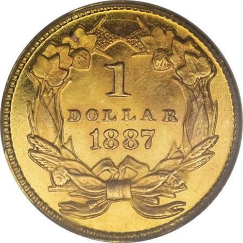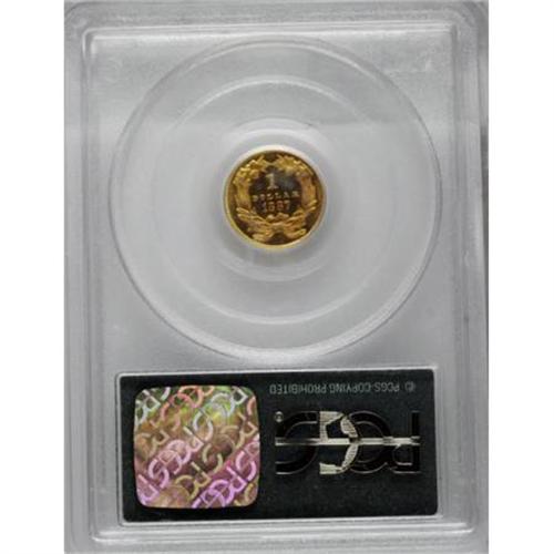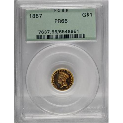 <B>1887 G$1 PR66 PCGS.</B></I> Except for the final-year 1889, the business strike gold dollars of the 1880s were produced in little more than souvenir quantities. The last business strike mintage that was more than lip service to the waning denomination came in 1874. As a result, many of the business strikes appear with prooflike surfaces, and they are sometimes quite difficult to distinguish from true proofs. In addition, the number of proof coins surged remarkably as the series neared its close. Those two factors combined tend to depress the prices of true proof coins from late in the series, but that era too appears to be coming to a close. This undeniable and superlative proof striking appears richly deserving of a Cameo designation, although the old-style PCGS green-label holder predates that era at PCGS. Rich gold-on-black contrast is noted on both sides, with brilliantly mirrored fields and thickly frosted devices. Both sides show deep, even, reddish patina. Evidence of contact is completely minimal and undistracting. Population: 9 in 66, 2 finer (7/07).<BR><BR><B>Coin Engraver:</B> James B. Longacre<BR><BR><b>Shipping:</b> Coins & Currency (<a target="_blank" href="http://www.heritageauctions.com/common/shipping.php">view shipping information</a>\)