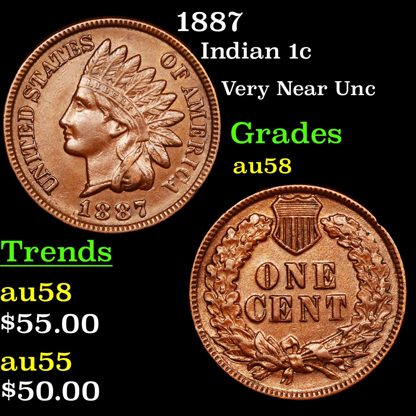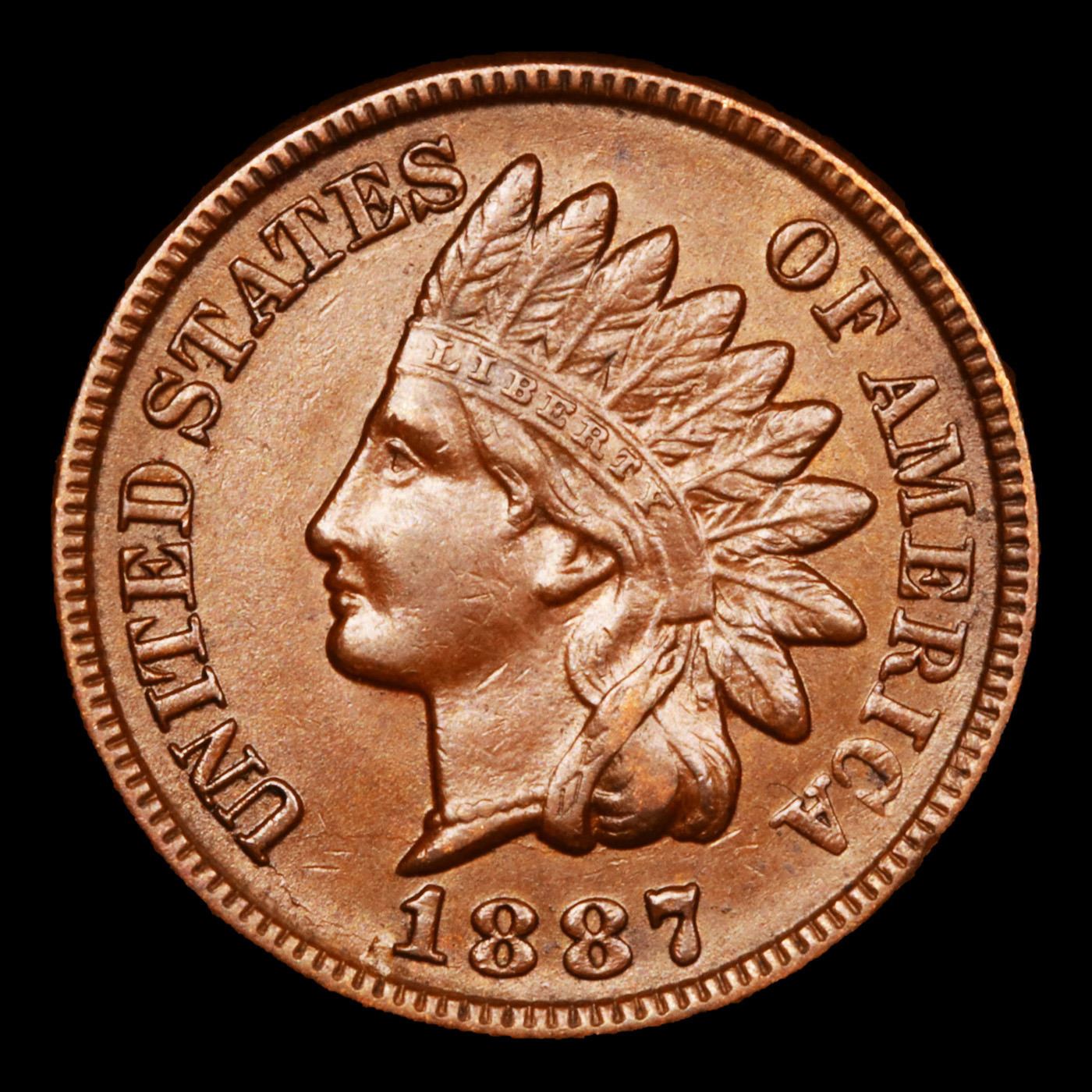 1887 Indian Cent 1c Grades Choice AU/BU Slider.