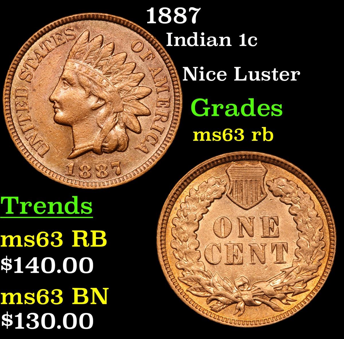 1887 Indian Cent 1c Grades Select Unc RB.
