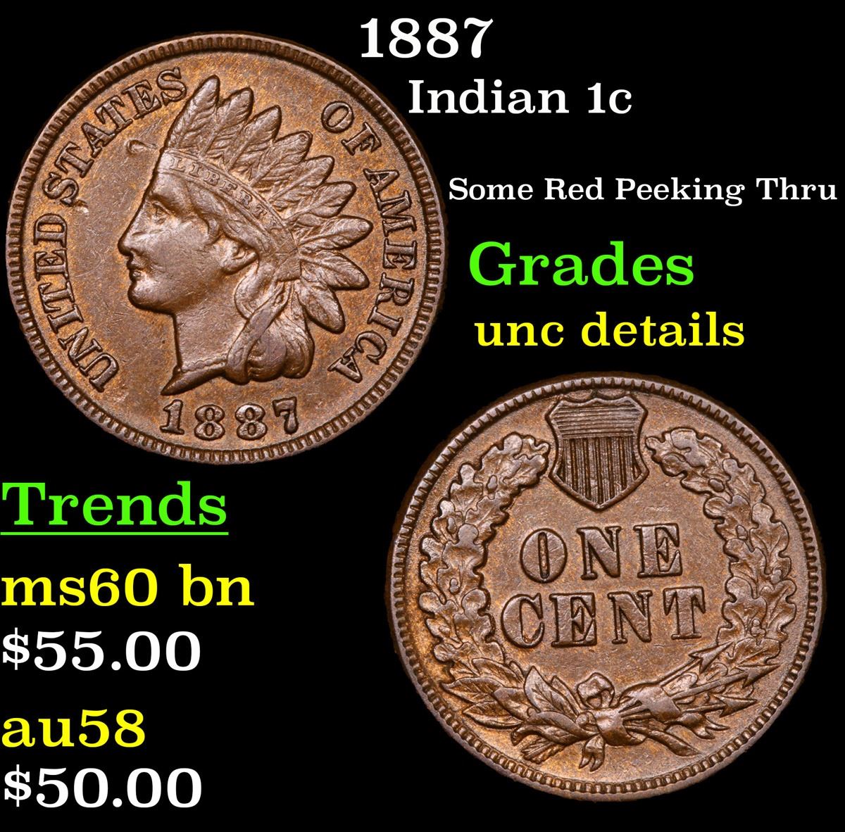 1887 Some Red Peeking Thru . Indian Cent 1c Grades Unc Details.