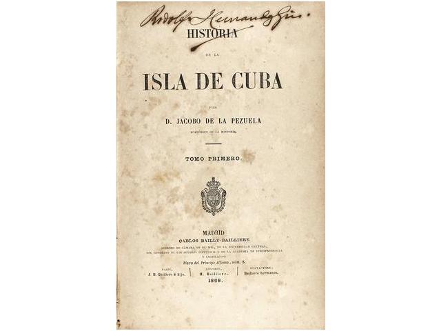 1887,. LIBRO: (CUBA-1ª EDICION),. PEZUELA, JACOBO DE LA:, HISTORIA DE LA ISLA DE CUBA., Madrid: por la casa de Carlos Bailly-Bailliere, 1868-1878. 4 tomos en 8º. I: 463 p.; II: 606 p., 1 h.; III: 446 p., 1 h.; IV: 281 p., 2 h. Encuadernación editorial en tela. Papel levemente oscurecido y quebradizo. Lomos muy frágiles. Algunas de las cubiertas estan parcialmente desprendias. El ejemplar está completo pero precisa nueva encuadernación. Jacobo de la Pezuela (1811-1878), fue Académico de Historia. La obra comprende hasta el Gobierno del Capitán General Gerónimo Valdés, a quien el autor sirvió de ayudante. Sigue siendo una de las más importantes obras sobre historia de Cuba, de referencia fundamental. Palau: 224590.