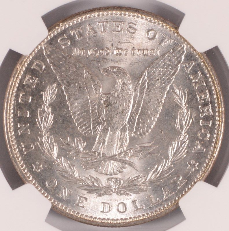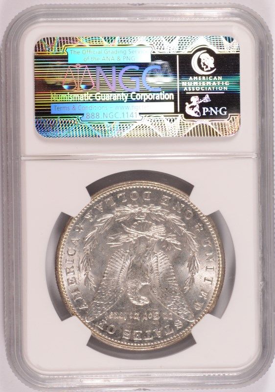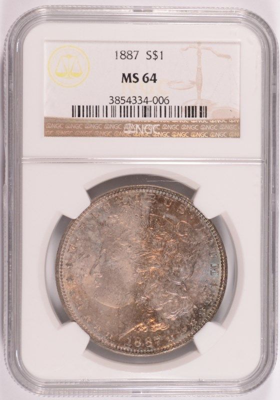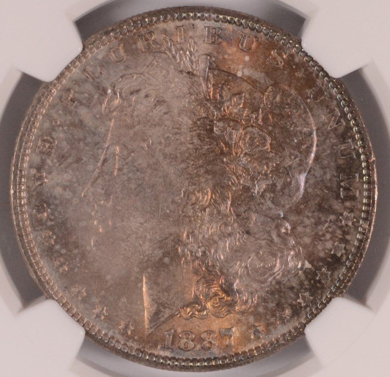 1887 MORGAN DOLLAR NGC MS-64 RAINBOW COLOR OBVERSE, WHITE REVERSE