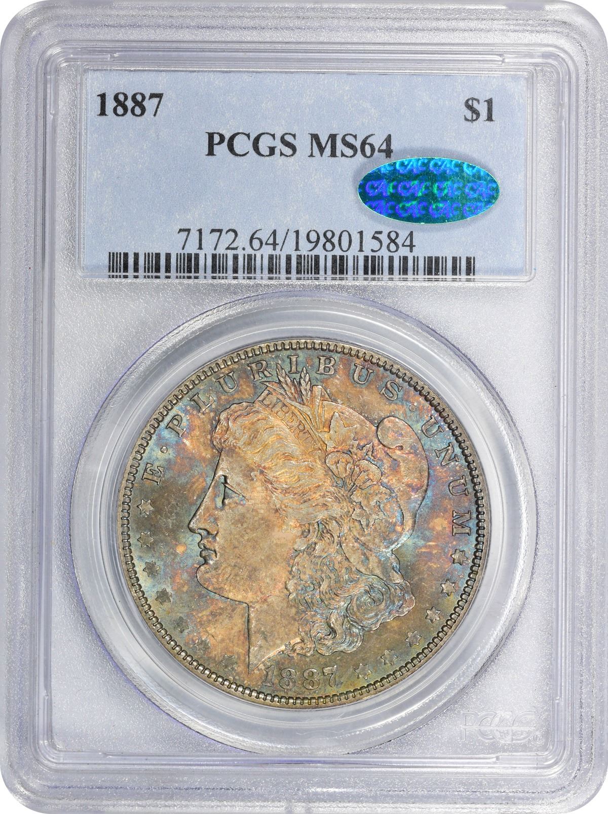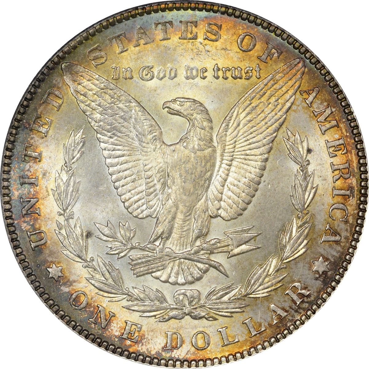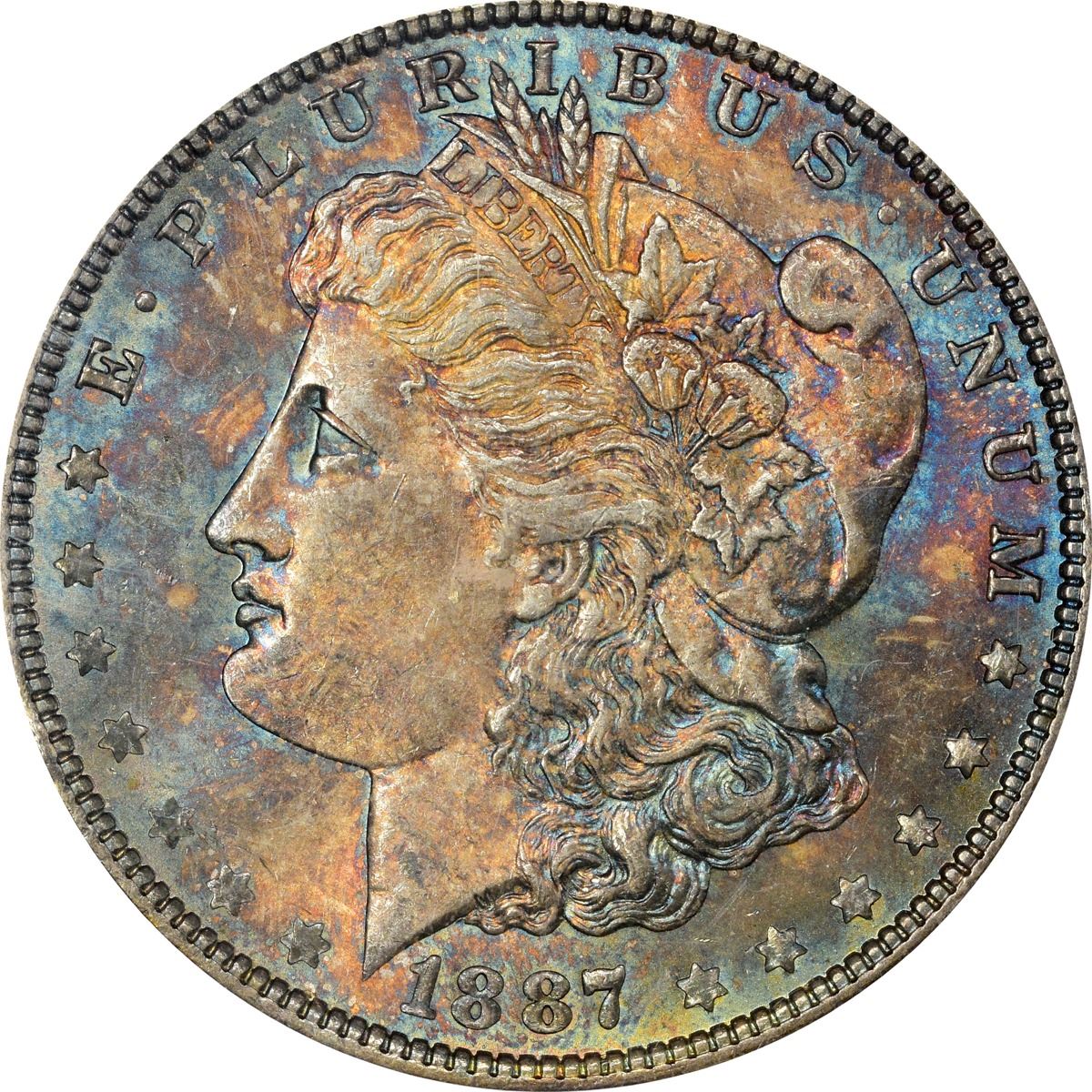 Bold cartwheel activity supports a wealth of richly varied neon-blue and electric rose toning on the obverse; the reverse is chiefly brilliant at the center with fiery orange and neon-blue iridescence at the rim. PCGS #7172