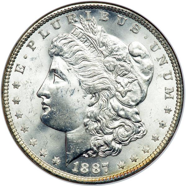 1887 Morgan Dollar. NGC graded MS-64. Star. CAC Approved. The reverse displays lovely rainbow toning. A simply exquisite specimen, the snow white obverse glistening with full, frosty textured luster while the reverse stands out like a shining beacon (PCGS # 7172) .