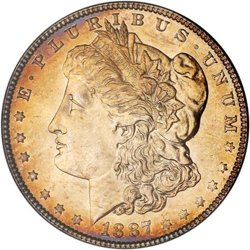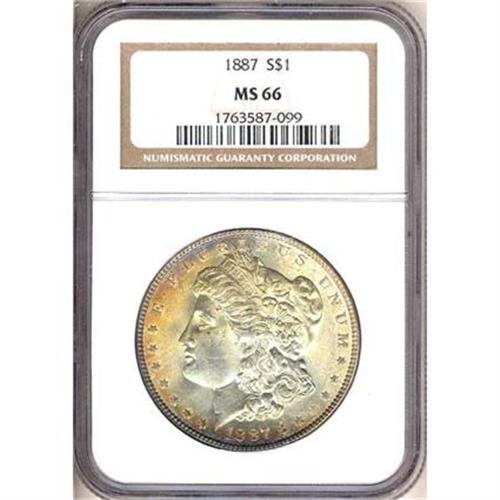 <b>1887 Morgan Dollar. NGC graded MS66.</b> Clean as a whistle, as one would expect from the grade; however, what really sets this coin apart from others is its intense cartwheel luster that rolls around each under the glowing gold toning. A hint of weakness at that is typically seen on much of this issue is missing on this sharply struck specimen, with the key central areas strongly hit by the dies <b>(PCGS # 7172)</b>