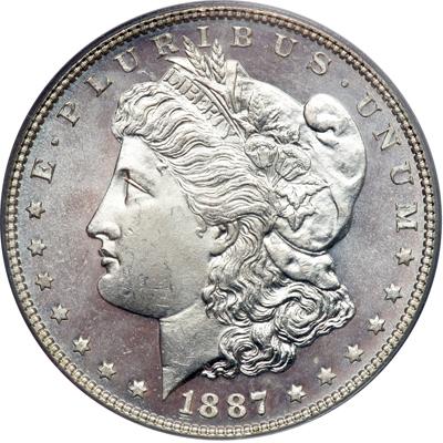 1887 Morgan Dollar. PCGS graded MS-65 Deep Mirror Prooflike PQ. A lovely white coin. The method of eliminating the also-rans is easy to accomplish when deciding whether to bid on this handsome Gem prooflike '87. There is no challenge. Pop 175; 30 finer in 66 (PCGS # 97173).