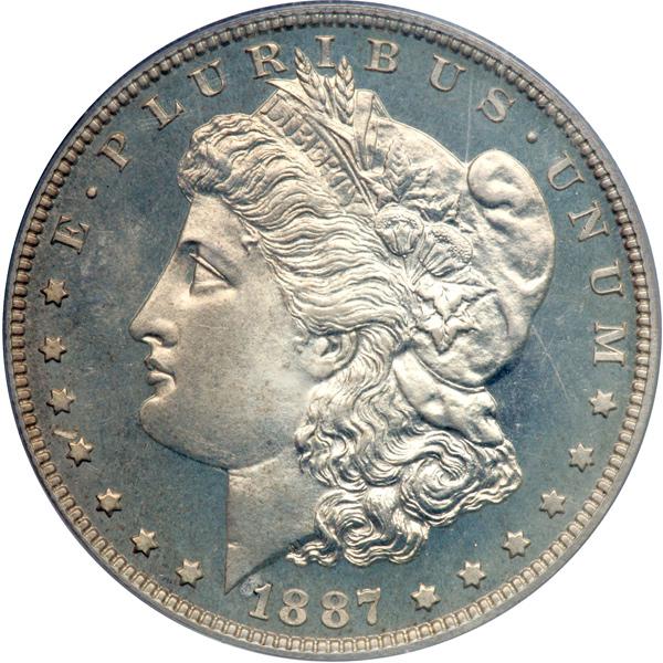 1887 Morgan Dollar. PCGS graded Proof 65. Only 710 Proofs struck. Mostly untoned. An affordable year for Proof Morgans, and often used for Type purposes. The devices are keenly sharp and struck with care, this year did not suffer the striking problems that some other Proof issues seen before and after 1887. Delicate toning in areas on each side of this splendid, reflective proof striking. Pop 26; 15 finer, 11 in 66, 3 in 67, 1 in 68 (PCGS # 7322) .