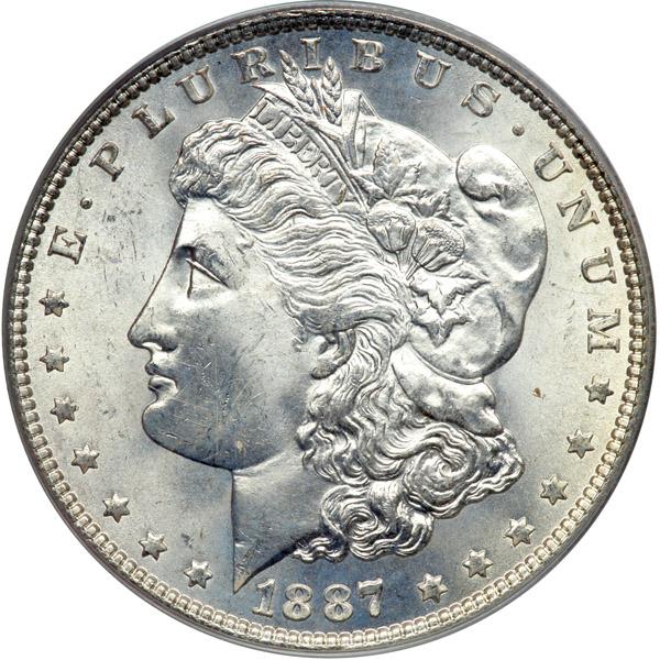 1887 Morgan Dollar. PCGS graded MS-65. CAC Approved. Housed in an Old Green Holder. Mostly white (PCGS # 7172) .