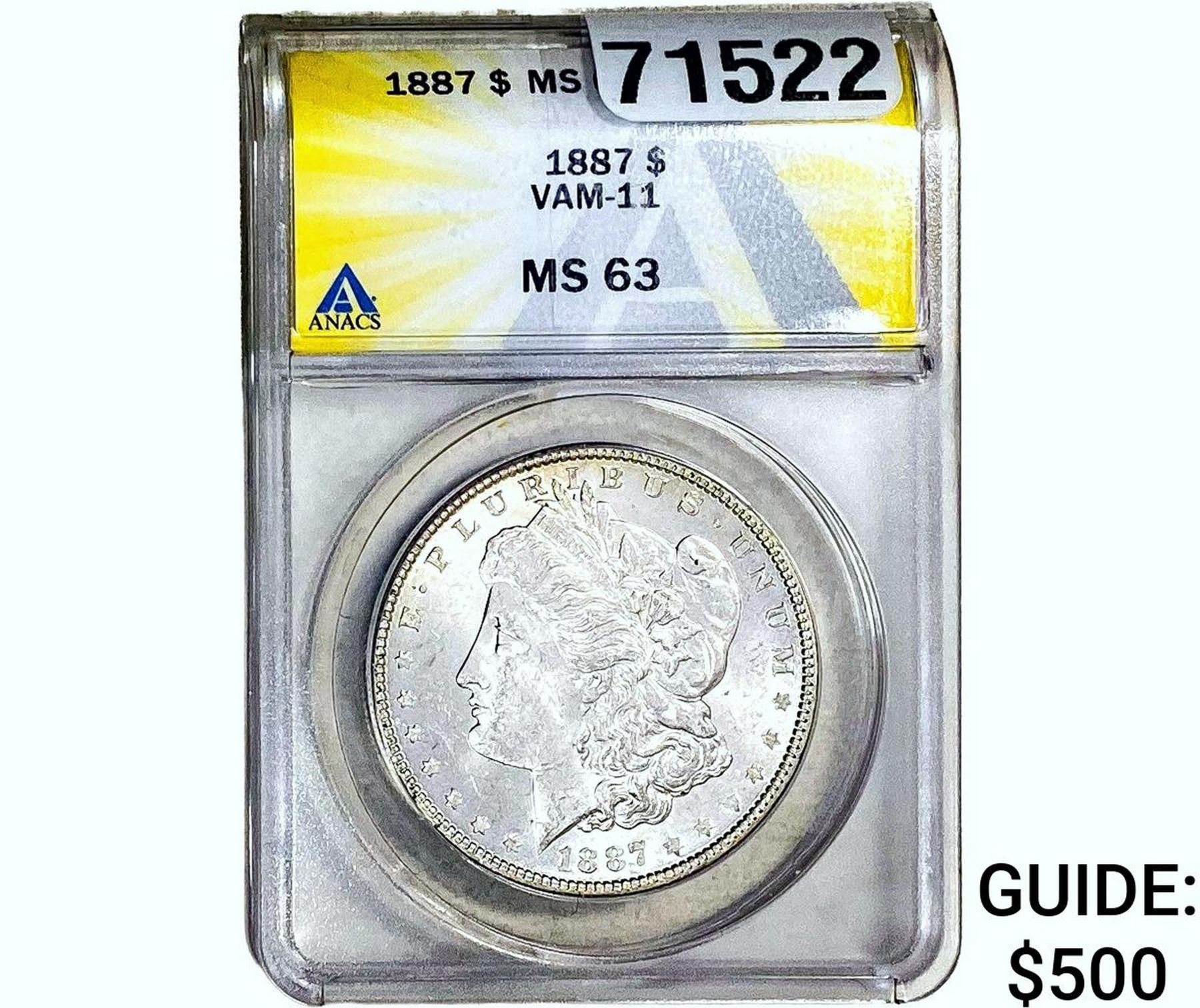 1887 Morgan Silver Dollar ANACS MS63 VAM-11