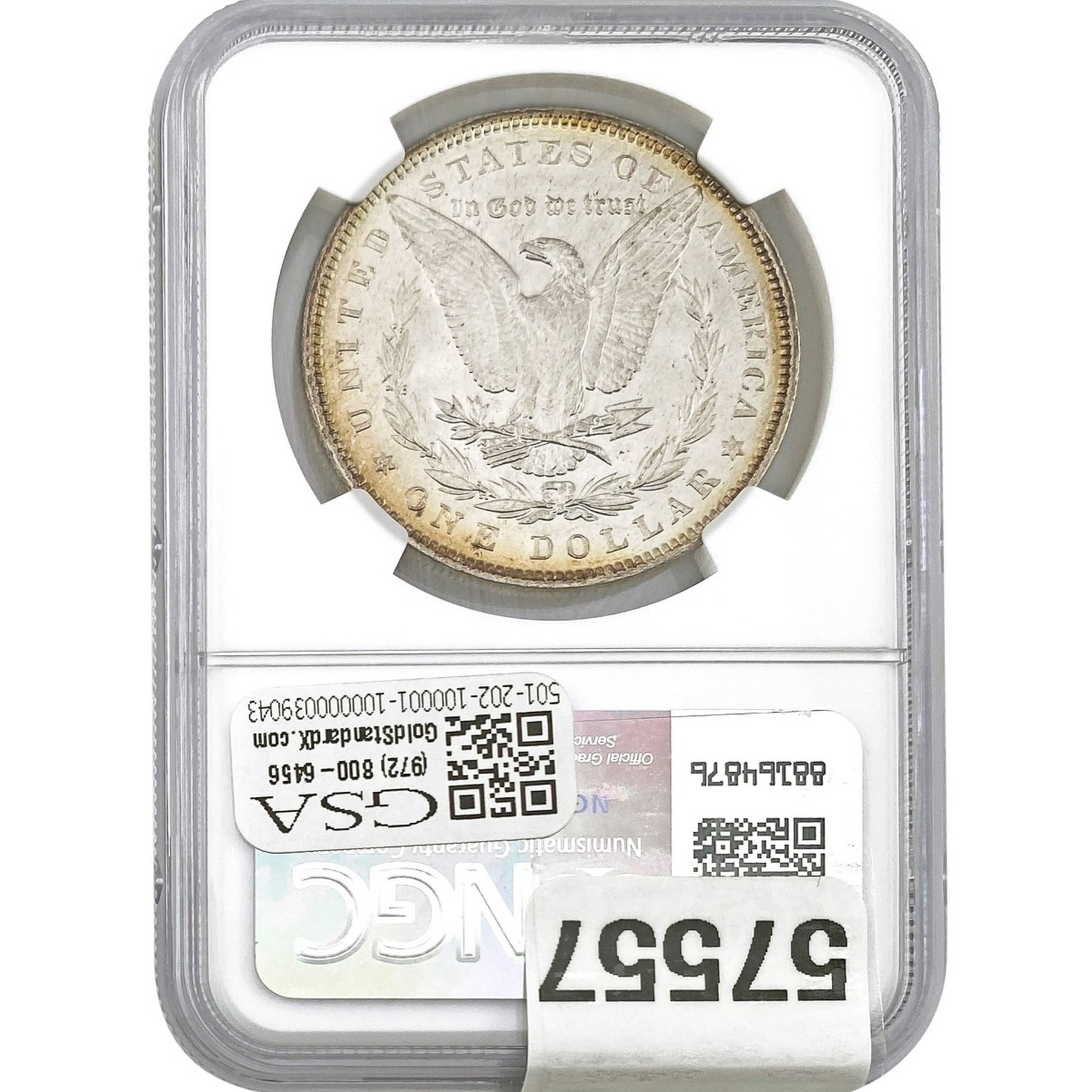 e. Coins sold referencing a third-party grading service are sold “AS IS” without any express or implied warranty, except for a guarantee by GSA that they are genuine. Removal or alteration of the holder, voids all of Bidder’s claims concerning that Product. Certain warranties may be available from the grading services and Bidders are referred to them for further details: Numismatic Guaranty Corporation (NGC), PO Box 4776, Sarasota, FL 34230, www.ngccoin.com/services/writtenguarantee.asp; Professional Coin Grading Services (PCGS), PO Box 9458, Newport Beach, CA 92658, www.pcgs.com/guarantee.html; ANACS, 6555 S. Kenton St., Ste. 303, Englewood, CO 80111; and Independent Coin Grading Co. (ICG), 7901 East Bellview, Ave., Suite 50, Englewood, CO 80111.
