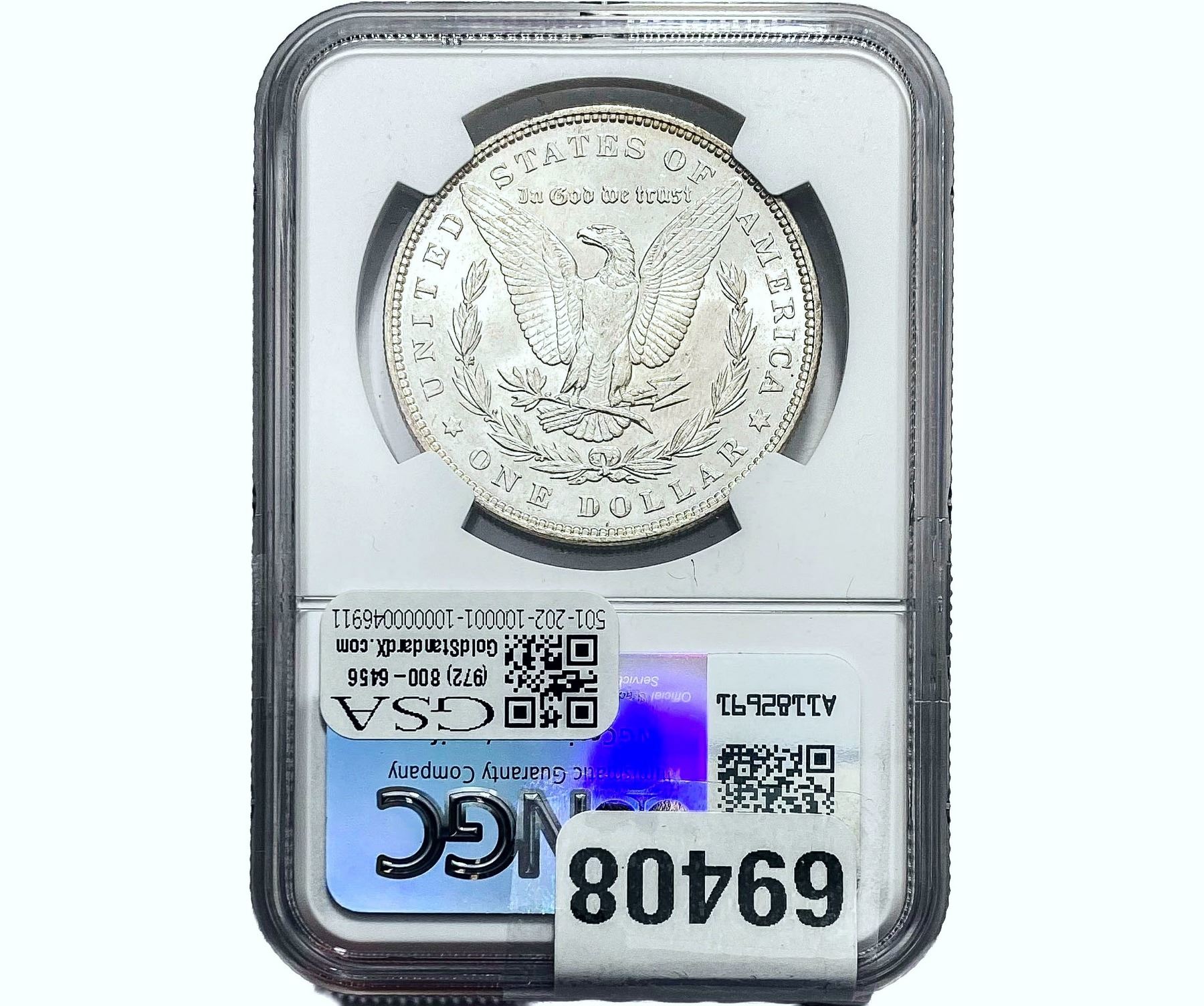 e. Coins sold referencing a third-party grading service are sold “AS IS” without any express or implied warranty, except for a guarantee by GSA that they are genuine. Removal or alteration of the holder, voids all of Bidder’s claims concerning that Product. Certain warranties may be available from the grading services and Bidders are referred to them for further details: Numismatic Guaranty Corporation (NGC), PO Box 4776, Sarasota, FL 34230, www.ngccoin.com/services/writtenguarantee.asp; Professional Coin Grading Services (PCGS), PO Box 9458, Newport Beach, CA 92658, www.pcgs.com/guarantee.html; ANACS, 6555 S. Kenton St., Ste. 303, Englewood, CO 80111; and Independent Coin Grading Co. (ICG), 7901 East Bellview, Ave., Suite 50, Englewood, CO 80111.