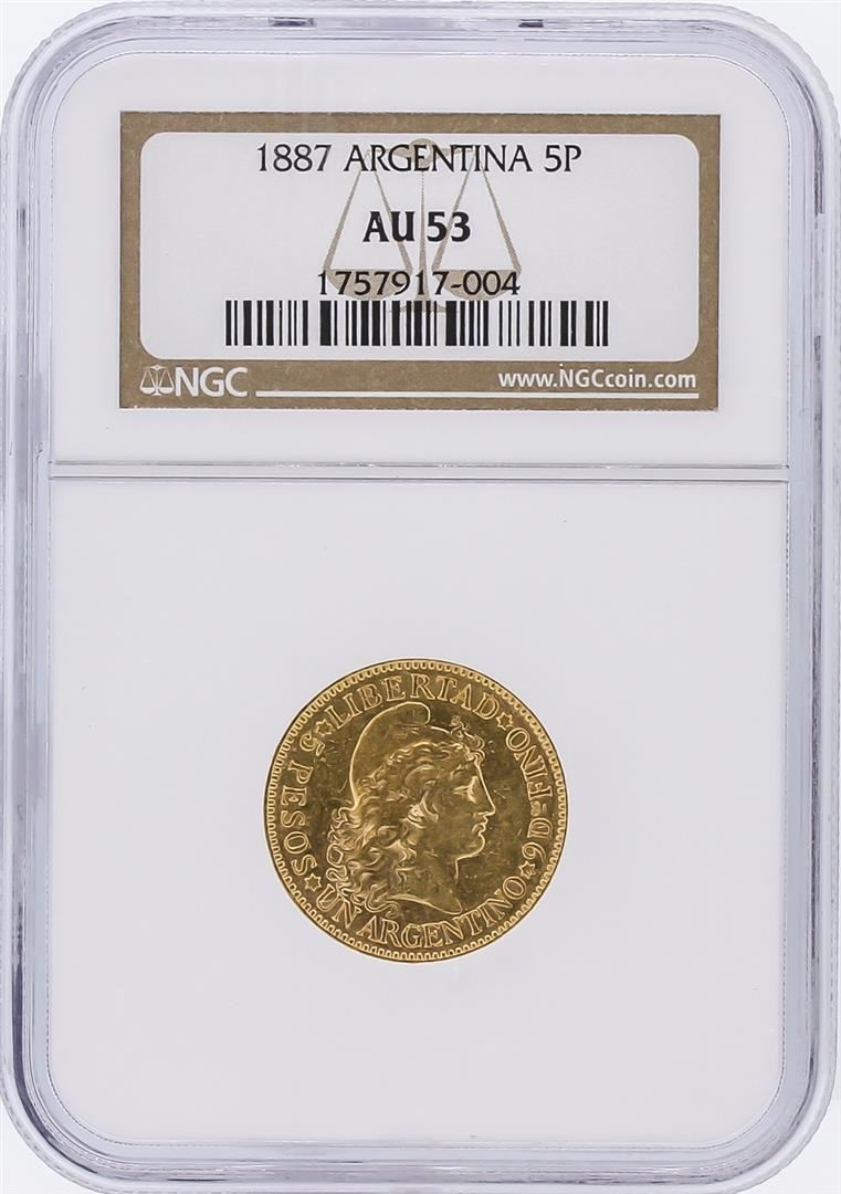 One 1887 NGC AU53 Argentina 5 Pesos Gold Coin. NGC Certified.