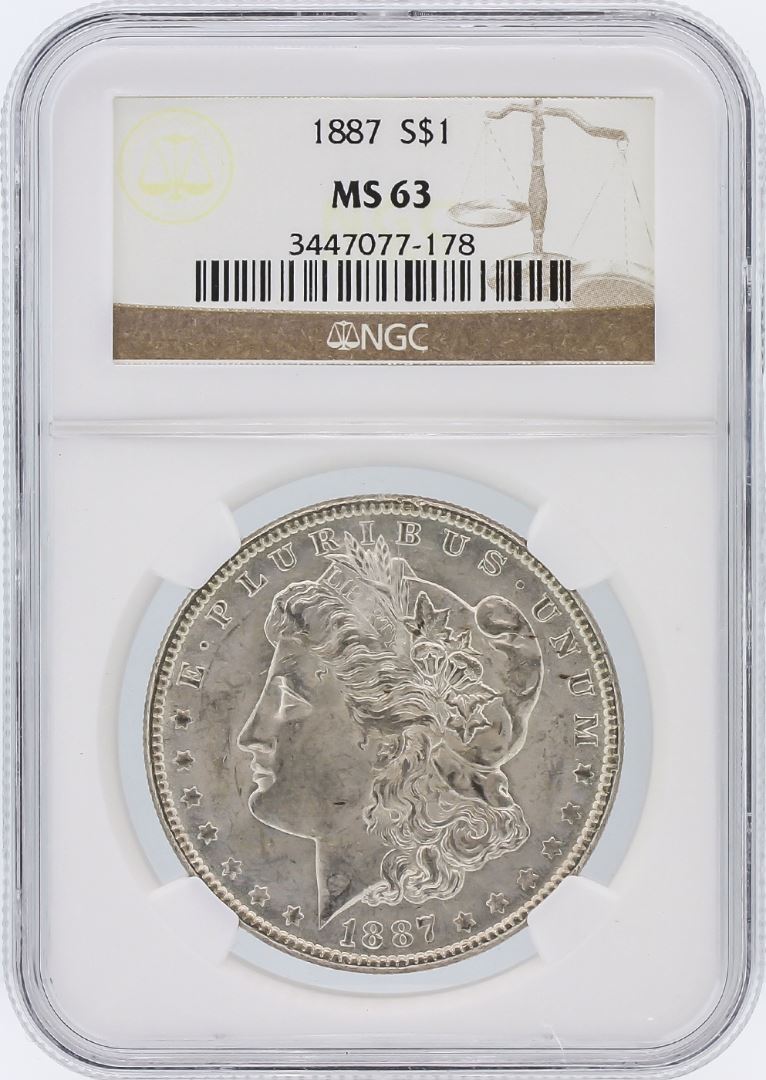 One 1887 NGC MS63 Morgan Silver Dollar.