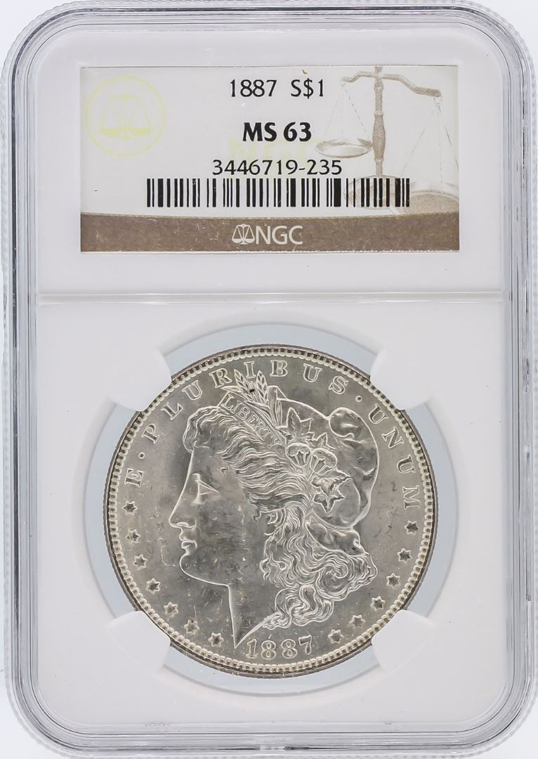 One 1887 NGC MS63 Morgan Silver Dollar.